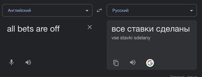 Но в аглийском языке есть такая идиома - all bets are off, что примерно означает "все отменяется", "правила больше не работают" или, допустим, языком гоблина (не претендую на точность, я не переводчик): "ставки отменены, все пошло по пизде". То есть буквально - подпольному бойцу Турецкого цыган дал люлей при покупке домика, из за чего Турецкий не смог поставить его на бой - и взятые ставки пришлось отдать и прекратить их прием.