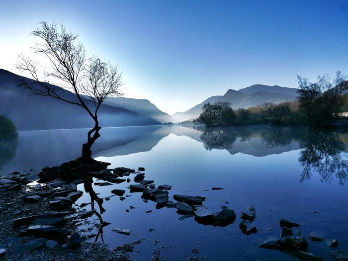 Далее по расписанию Llyn Padarn. Это красивое озеро. На нем есть мелкие островки с торчащими деревцами. Вокруг горы, каменные заборчики и овцы. А еще там практически никого вокруг. Тишь полнейшая. Нам не повезло в плане тумана, который упал стремительным домкратом