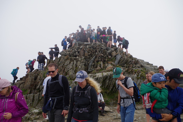 Можно попытаться взойти на Snowdon. Переход долгий, но и виды великолепные. Я был не один, поэтому вместо пешего маршрута предпочел железную дорогу. На паровозике подниматься вверх всего час. Виды те же, только быстро. Наверху полно людей, просто не протолкнуться, даже в плохую погоду. Ну и погода меняется там прямо на глазах. У подножия ярко светило солнце, наверху туман и дождь.Вот так выглядит самая высокая вершина Англии: