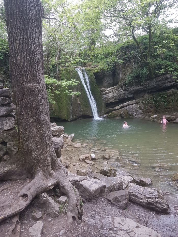 По пути к стоянке встретили еще одно примечательное место. Небольшой водопад и заводь были запечатлены в фильме "Робин Гуд". Вода, к слову, холодная!