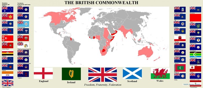 Кроме того, Елизавета II возглавляет Содружество наций. Это организация бывших британских колоний, центром которой до сих пор является Лондон. Население Содружества — 2,3 млрд человек, в него входят 53 страны мира. Тем самым Британская империя, над которой никогда не заходит солнце, продолжает существование в форме огромной конфедерации.