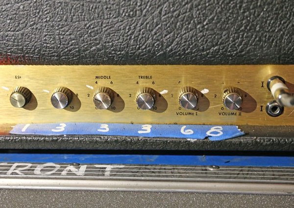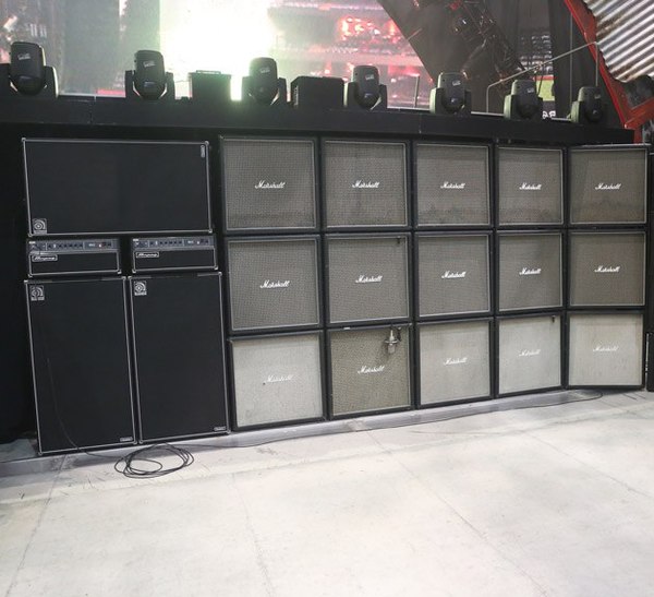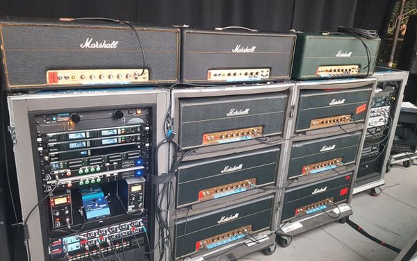 Система усилителей Энгуса: девять голов Marshall по 4х12, загруженные 25 ваттными динамиками Celestion Greenback. Использует беспроводную систему Shure Axient вкупе с заказным усилителем Mike Hill.
