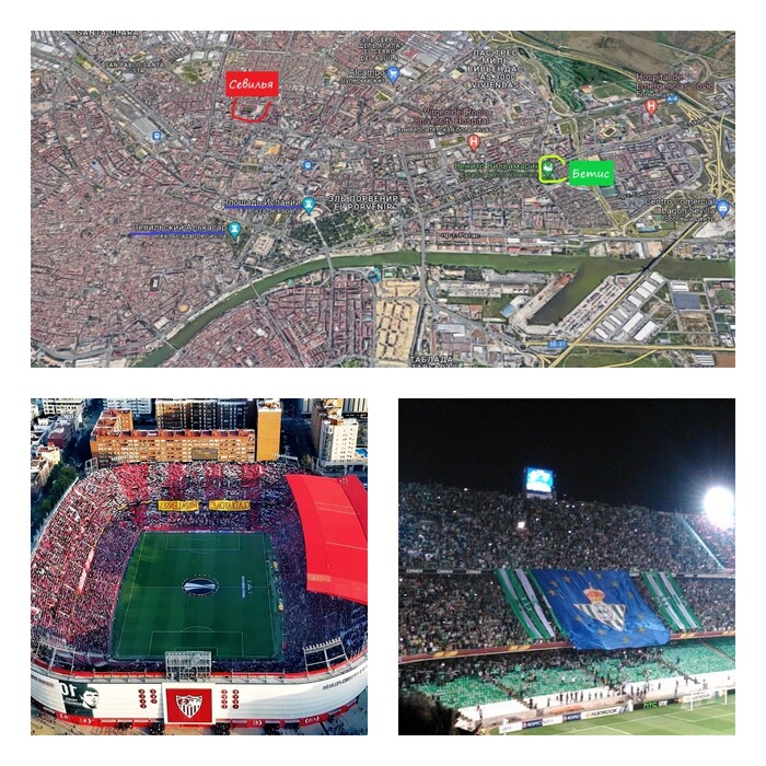 Стадион Бетиса – «Бенито Вильямарин», один из крупнейших в Испании, 61 тысяча зрителей. 37°21'23.0"N 5°58'53.0"W – Google Карты. Построен почти век назад, с тех пор множество раз реконструировался. Дом для ФК Севилья – «Рамон Санчес Писхуан», чисто футбольная арена. Названа в честь президента клуба, возглавлявшего его почти 25 лет. 37°23'02.0"N 5°58'14.0"W – Google Карты. Вместимость меньше чем, у противников – 45 500 зрителей. Стадионы находятся на расстоянии 3 км друг от друга.