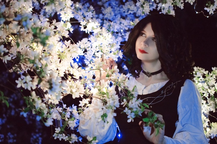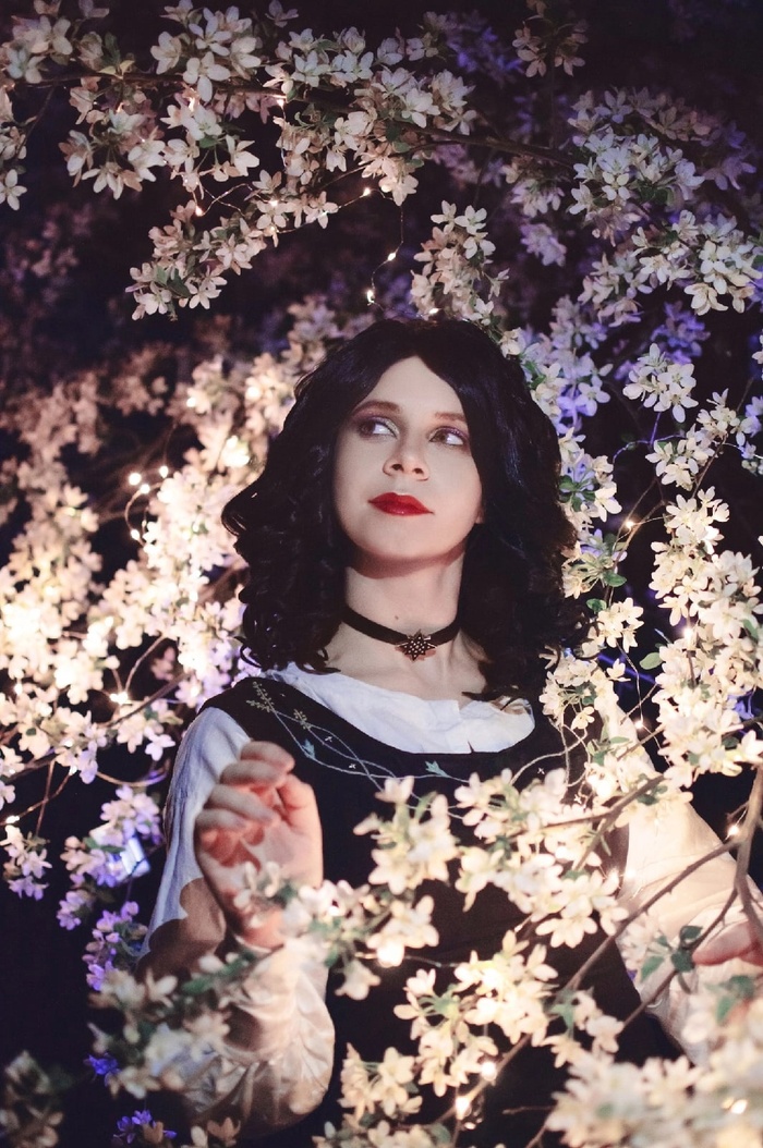 Мне давно хотелось создать новый образ Йеннифэр, что-то сдержанно-повседневное, что вписывалось бы в мир, но не кричало деталями. В это платье я влюбилась, едва увидев арт. Простое, но достоверное, такое, в каком она могла быть в их первую встречу с Геральтом. Я много раз перечитывала книги, ища подробности, нашла в основном несостыковки (лопнувшее на Йен платье во время их борьбы не могло открыть грудь, ведь на ней была рубашка с жабо). Но всё же мне кажется, среди всех платье с буфами и корсетами именно такой лаконичный образ отзывается книгам.