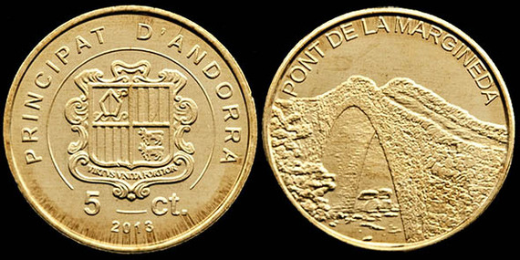 5 сантимов 2013г. княжества Андорра. На аверсе герб княжества. 23 мм диаметр, латунь.