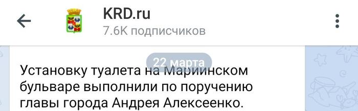 Напомним, 27 декабря прошлого года мэр кубанской столицы Алексеенко проводил рабочее совещание. Во время него он поругал ответственных лиц за установку общественного туалета на Мариинском бульваре.