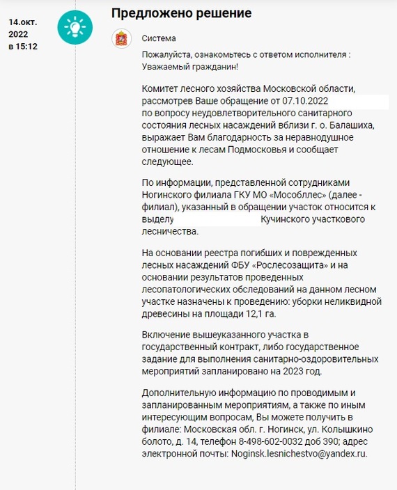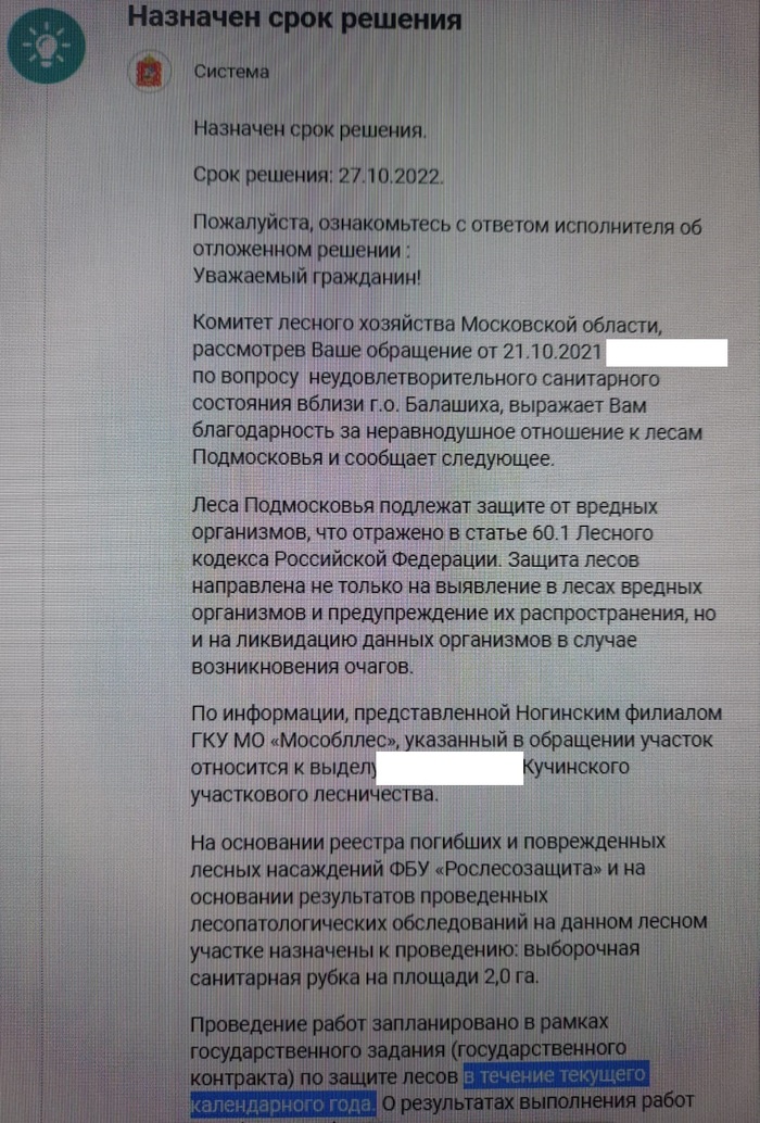 10 дней на рассмотрении (с перебросками от одних к другим, в итоге упало на Комитет лесного хозяйства МО), потом приходит ответ.