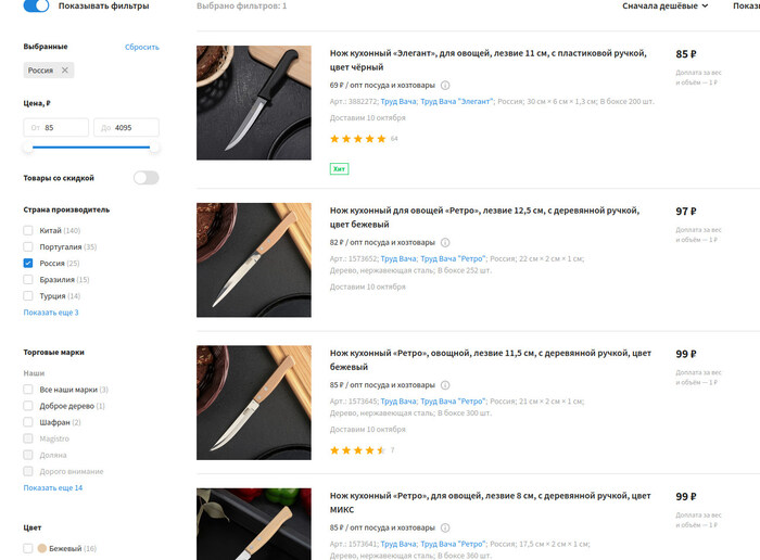 При том что отечественная продукция, например ножи от Труд Вача из поселка Вача Нижегородской области в ассортименте есть, только почему-то доступны не на полке, а в каталоге.
