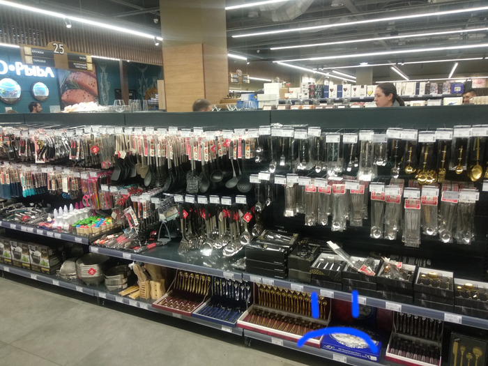 Столовые приборы. Здесь все плохо - абсолютно все китайские, причем не лучшего качества. У вилок торцы зубьев не прошлифованы. В России как минимум столовые приборы делает Ашинский мателлургический завод и Нытвенский металлургический завод. Почему у патриотического бизнесмена все столовые приборы на витрине - китайские?