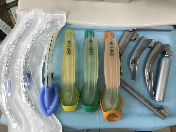 Справа налево. Ларингоскоп с набором клинков. Цветные штуки, похожие на дилдо, это так называемые надгортанные девайсы для обеспечения проходимости дыхательных путей. Оранжевая, зеленая, желтая это i-gel. Cиняя это ларингеальная маска. Следующее это интубационные трубки с манжетой.