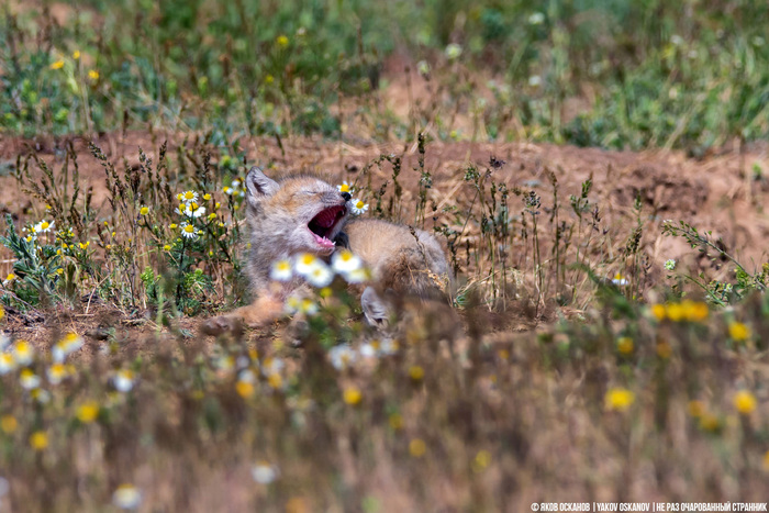 Это корсачата из первой норы. Той, где они самые молодые. Только вылезли из норы, ещё глупые и доверчивые. Можно снимать практически не таясь. Без маскировки. Подпустить они вас не подпустят, чтобы в руки взять (да это и не нужно делать), а сесть метрах в десяти на стульчик - запросто. Сиди и снимай, как эта малышня живёт. Только вот малышня в таком возрасте двигает скупо. В основном спит.