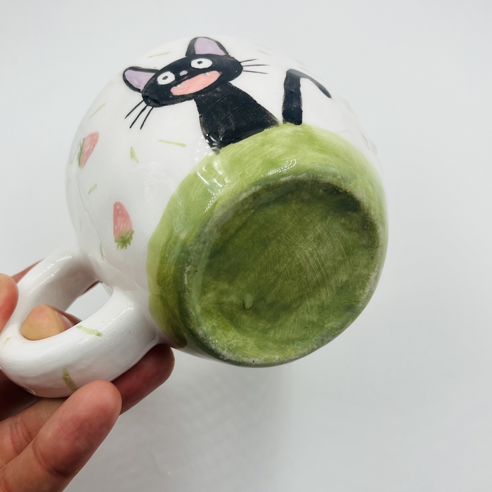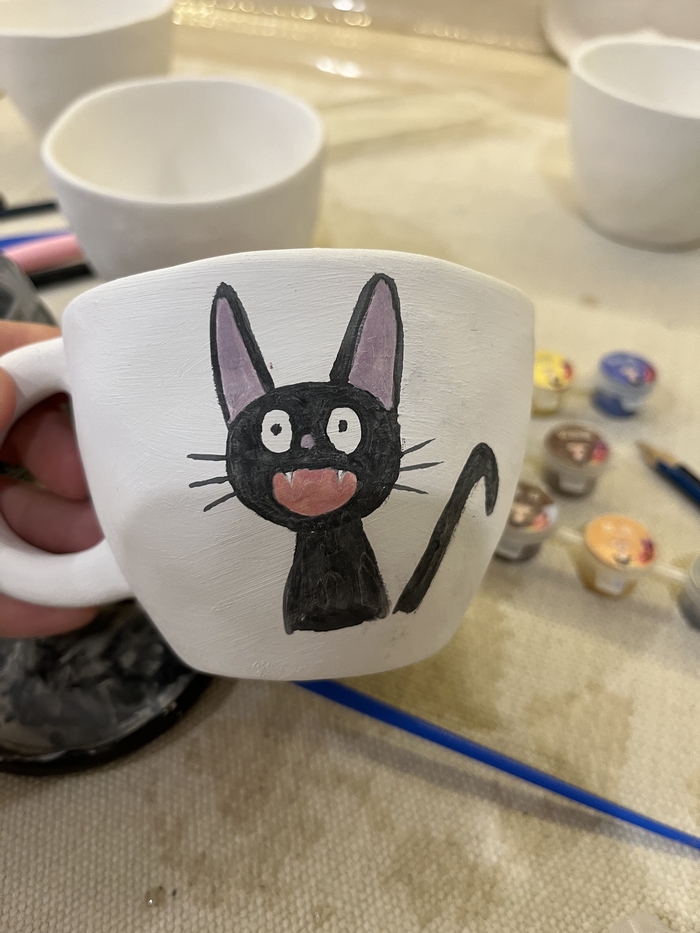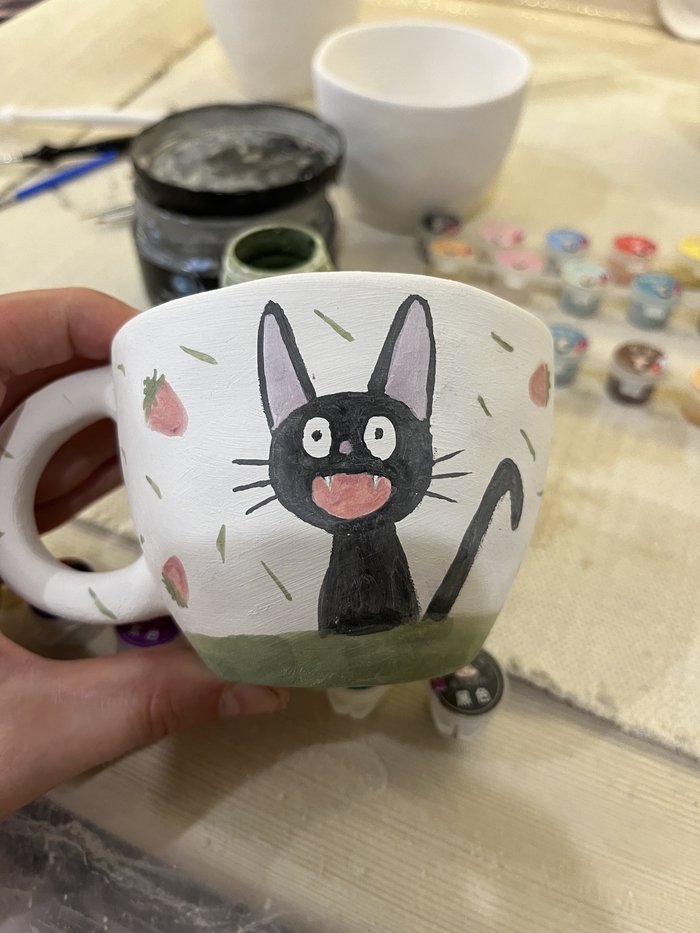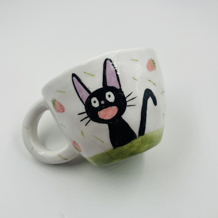 Привет! Я Света и я художник-керамист. Ещё я большая поклонница Хаяо Миядзаки и регулярно обращаюсь к его волшебным фильмам. Захотелось мне давеча сделать что-то типа "картины маслом" на кружке. То есть я буквально хотела воспроизвести эффект масляной живописи, чтобы вроде как картина на холсте. Процесс оказался сложнее, чем я ожидала: обожжённый черепок очень отличается по текстуре от холста, а пигменты от любой из привычных красок, будь то акварель, акрил или масло, ощущение непослушности материалов. Чтобы получились выраженные "мазки", я наносила пигменты в несколько слоев, и (на фото этого не увидеть), но рисунок вышел немножко объемный, его можно пощупать)