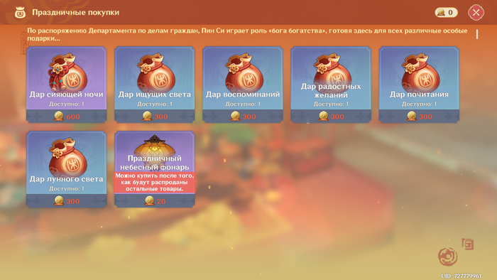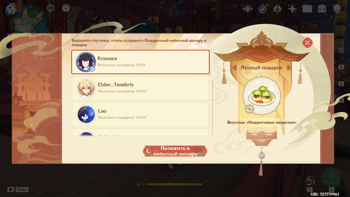 В любом случае, как по мне праздник вышел интересным. По крайней мере дают: бесплатные камни, возможность запускать фонарики для остальных игроков и дарить подарки, а также просто бегать и срезать кусты "золотых деревьев".