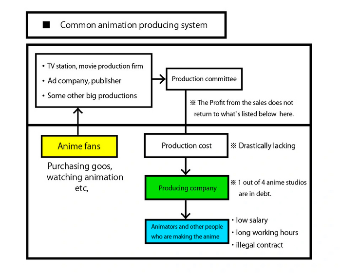 Основная проблема несправедливого распределения доходов - в консервативном подходе к бизнесу. Если на Западе студии, занимающиеся созданием мультфильмов или сериалов - получают свою долю от сопутствующих доходов, выступая в качестве равноправного партнера, то студии в Японии являются лишь подрядчиками. Разумеется, что многое будет зависеть от самой компании и контракта, а также от умения договариваться, но в подавляющем количестве случаев - договориться не получается и, если руководство компании встает в позу и начинает перечислять условия и требования, то заказчик просто идет в другую, где коллеги окажутся более сговорчивыми. Правда, у них, как и у нас - всегда есть те, кто ровнее остальных. Дело в том, что за распределение бюджета (а это не только создание продукта, но и производство мерча, лицензирование для ТВ, право на прокат в других странах, реклама и пр.) - отвечают так называемые "производственные комитеты", по сути те, кто непосредственно финансирует сериал по всем направлениям: маркетинг, дистрибуция, мерчендайзинг и остальное.