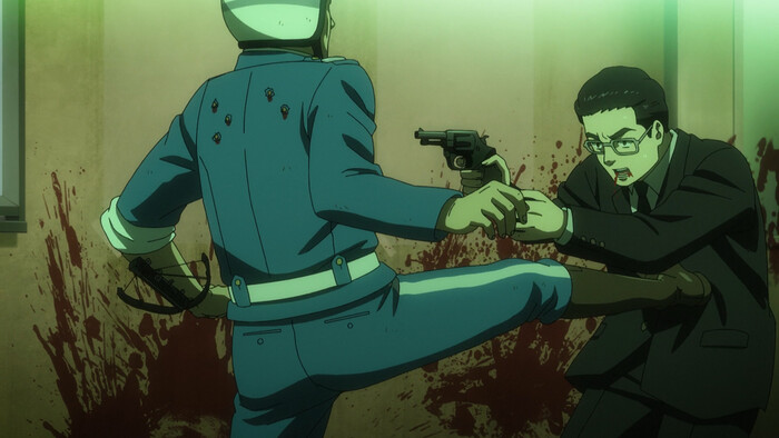 В-третьих, собственно, выделим и то, насколько аниме жестокое. Переломанные кости, разлетающиеся головы, горы трупов и реки крови — всем этим действо на экране забито под завязку. Именно так и должно выглядеть что мрачное будущее, что выходящее из под контроля слабых людей настоящее.