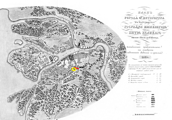 Красный отрезок - мост, где-то на месте жёлтого овала стоял караульный дом. Упомянутый Андрей Тризин — это архитектор Доменико Трезини, чьим ангелом на Петропавловском соборе я сейчас любуюсь в окно :)