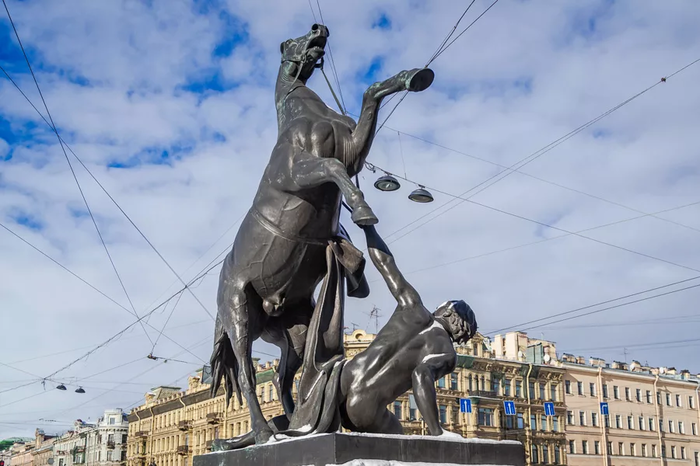 Устои нового моста планировалось украсить конными группами. Как раз в то время петербургский скульптор Петр Клодт работал над двумя скульптурными группами бронзовых коней с их укротителями – братьями-близнецами Диоскурами, героями древнегреческой мифологии. Они должны были украсить Университетскую набережную. Но планы поменялись – на набережной установили древние изваяния двух сфинксов 13 века, доставленных из Египта.