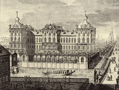 Гравюра М.И. Махаева показывает нам, что проблемы с парковкой были в Петербурге всегда — даже для лодок. Слева барка входит через ворота во внутренний водоём дворца. Справа Аничков мост, кони пока только живые. Сзади-справа на месте нынешнего памятника Екатерине Великой высится церковь. За дворцом, по идее, свежевысаженный парк.