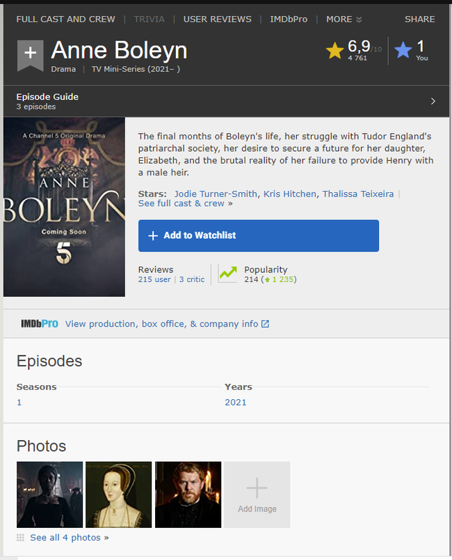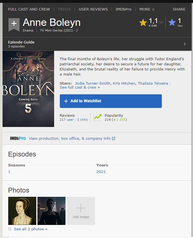 На IMDB жэсточайшэ заминусовали сериал Анна Болейн, ему поправили рейтинг. Распределение рейтинга поправить забыли🤷🏻♂️