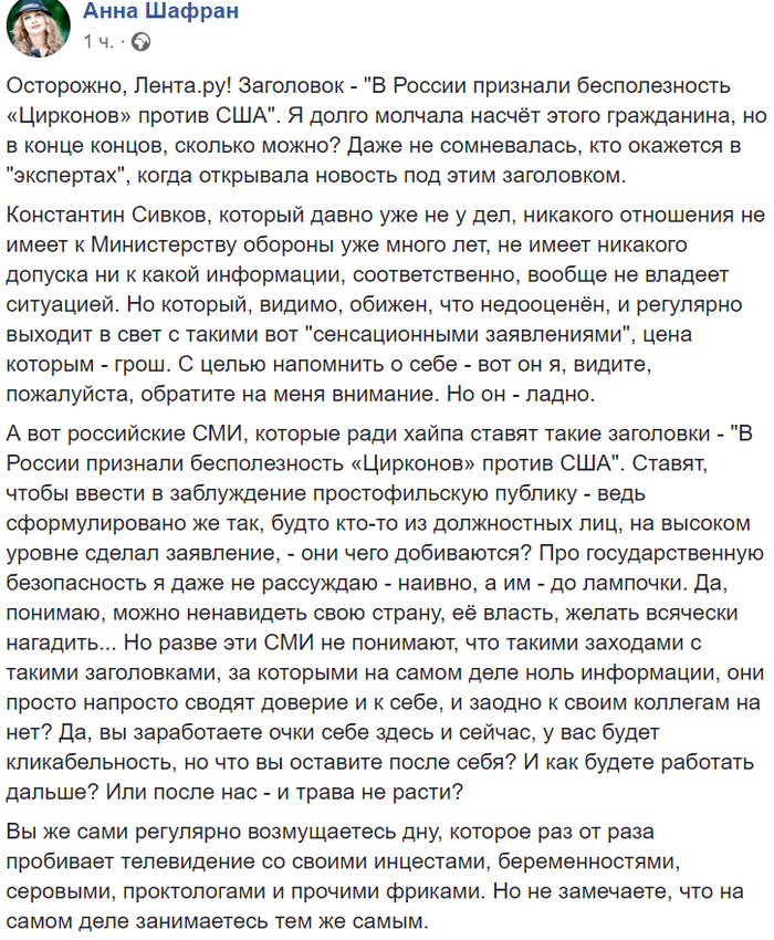 Радиоведущую Анну Шафран возмутил условный приговор в отношении студента Егора Жукова. На своей странице в Facebook она назвала его бесстыдно мягким, самого Жукова «мамкиным революционером», а его идеи, высказанные в видео, она считает хуже прямых призывов вешать на столбах.