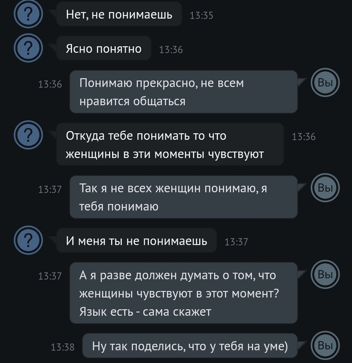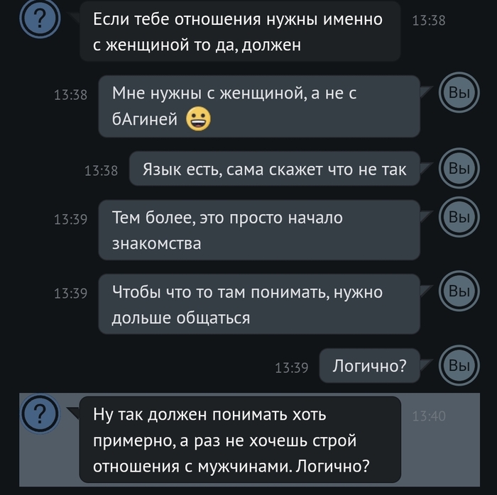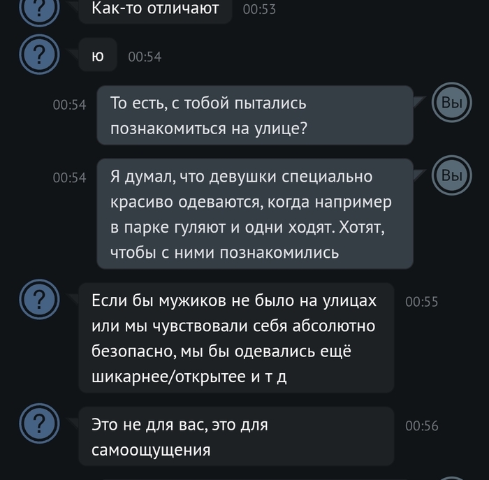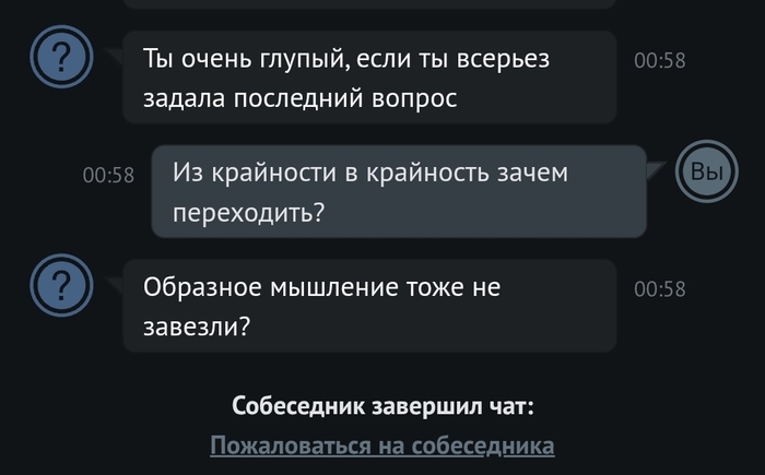 Всем доброй ночи (или что там у вас). Зашёл я тут в анонимный чат, решил провести социологический опрос женской части населения на тему "знакомства в реальной жизни". Личных данных нет, поэтому спокойно и с чистой совестью выкладываю коротенькую переписку. Короче у одной дамы подгорело явно. Она меня и оскорбила и сама покинула чат. Думаю контент зайдёт)))