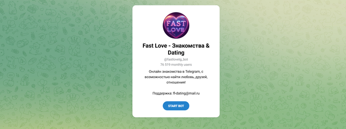 FastLove — это телеграм-бот для анонимных знакомств, где переписка начинается мгновенно, без регистрации на сайте и лишней информации. Вы заполняете несколько полей, запускаете бот — и попадаете в чат, где можно общаться инкогнито, обмениваться фото, искать женщин и мужчин, пока не почувствуете настрой перейти к личному контакту.