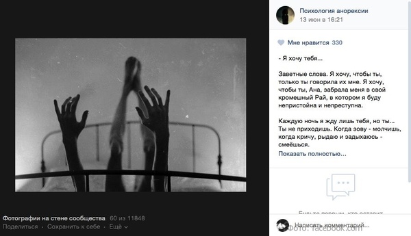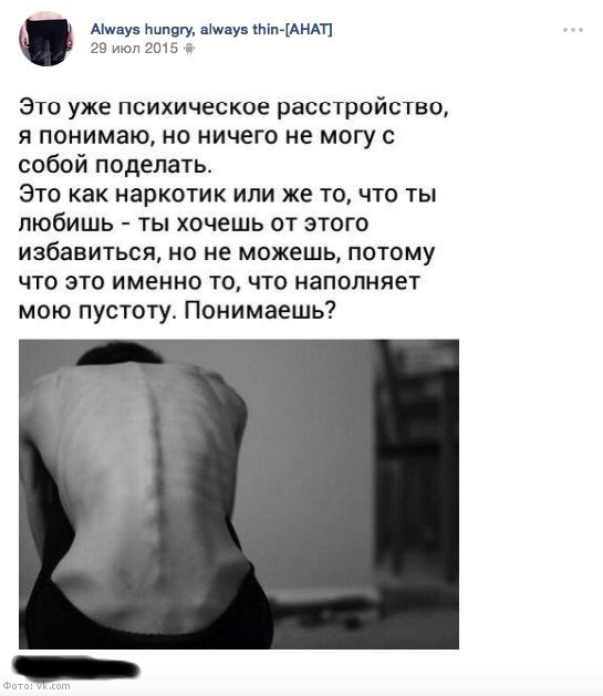 И если в прошлом веке анорексией болели в основном модели и балерины, то в наше время анорексия превратилась в своеобразной культ или молодежное течение, ― называйте, как хотите. Девушка, больная анорексией, стала своеобразным эталоном сексуальности и объектом для подражания.