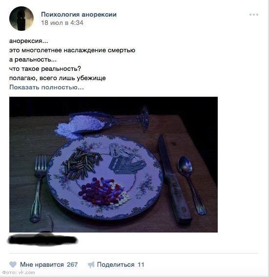 Стремление похудеть привело к тому, что многие молодые люди осознанно хотят заболеть анорексией, чтобы быстро стать похожими на свой идеал. При этом молодые люди прекрасно знают о страшных последствиях этого заболевания, знают, что могут умереть, но даже этот факт их не останавливает. «а я хочу быть стройной, я хочу болеть анарексией … я знаю, что это вредно для организма, что от этого умирают … но я хочу быть худенькой, чтобы все смотрели и завидовали … наверное, это звучит глупо, но я просто очень-очень хочу! что мне делать …???», ― объясняют на тематических форумах свою позицию анорексики.