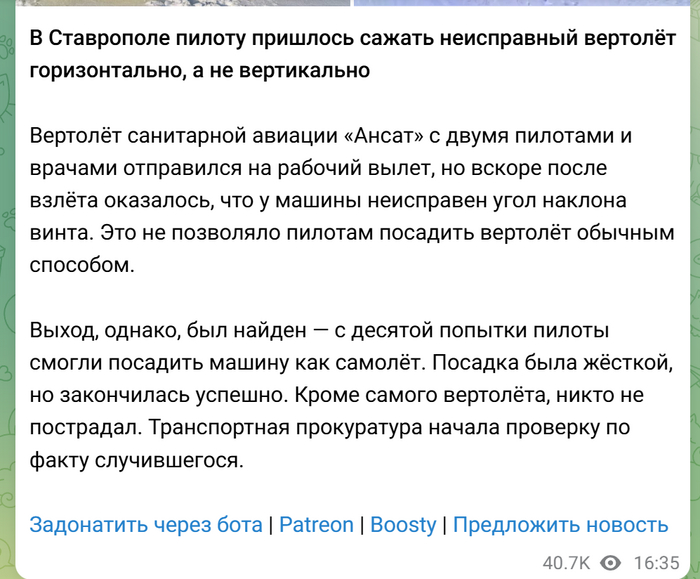 20 февраля 2025 г. около 16:00 на аэродроме Ставрополя совершил аварийную посадку медицинский вертолет Национальной службы санитарной авиации Ростеха после частичной потери управляемости. На борту находились два пилота и два медработника. Предварительно сообщают что обошлось без жертв.