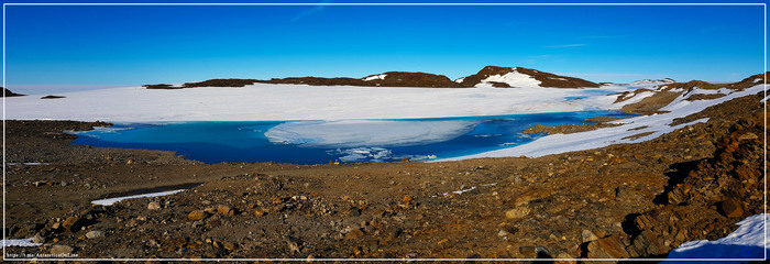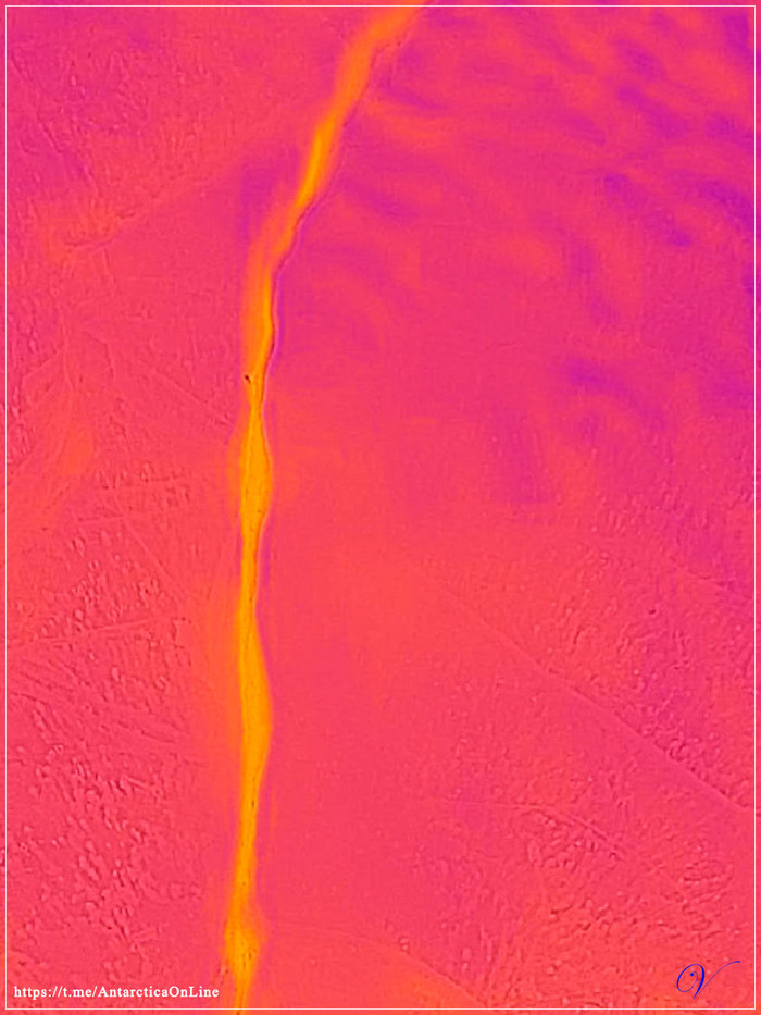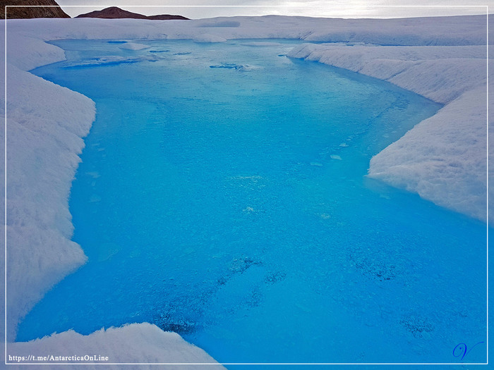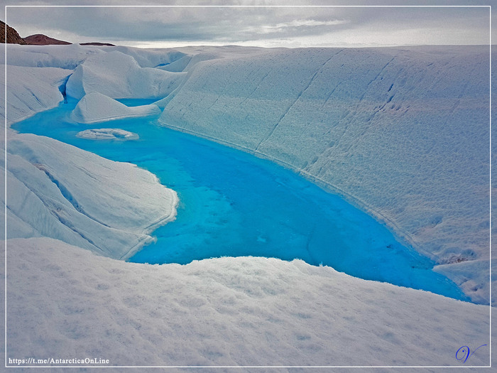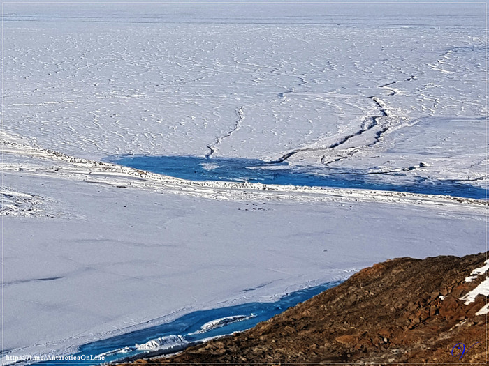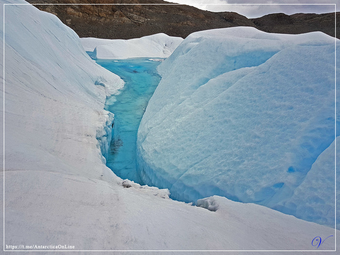 Кстати, наука в лице специалиста из Финской Антарктической программы, меня тут просветила и сказала, что та двойная трещина, что вдалеке за моей спиной - это зимняя приливная трещина. А та, что ближе и с озером между трещинами - это летняя приливная трещина шельфового ледника. Мол, зимой лед примерзает к берегу в бухтах, и трещина идет снаружи бухт, а летом лёд взламывается уже внутри бухт.