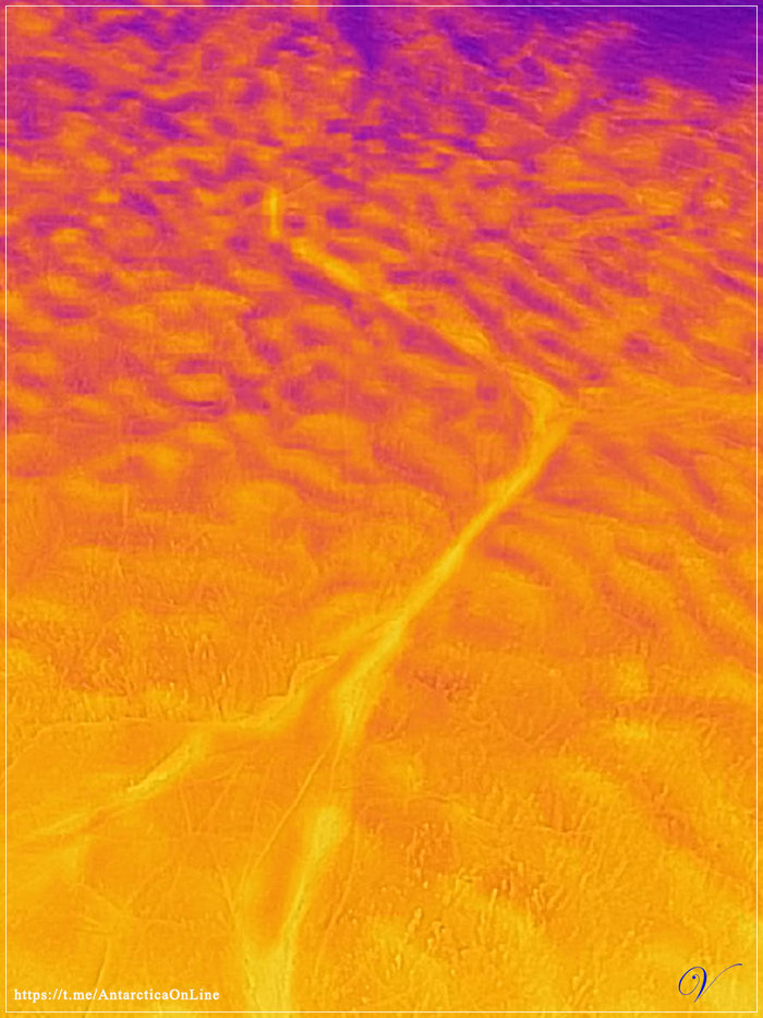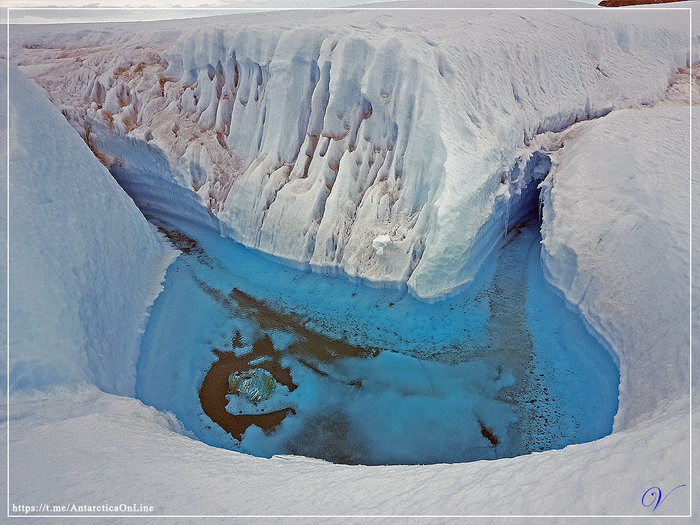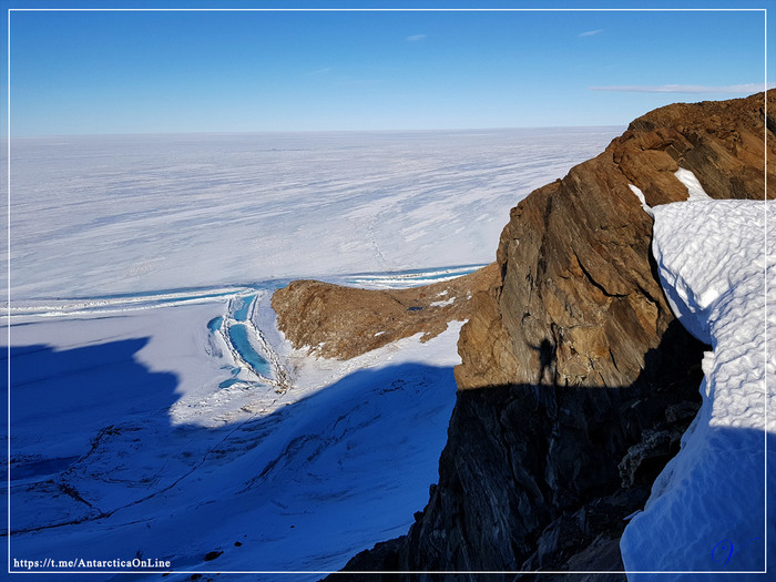 Согласно карте это озеро «Привальное» в которое впадают три реки с шельфового ледника. До речек 1 километр, но их шум был отчётливо слышен. Средняя река самая бурная и глубокая, а вот та, что справа, появляется из дыры в леднике. Осенью надо будет проверить там пещеру.