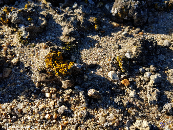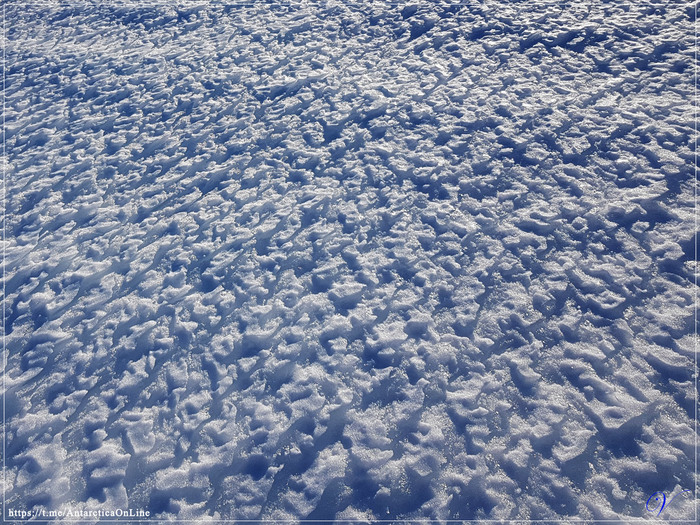 Сверху тонкая корка льда, а под ней «ледяной горох» вперемешку с водой. Глубина такой смеси не предсказуема, так что далеко отходить от снежной дороги не стал. Дальше пришлось выходить на скалы. Зато сделал фотографию снега для фонов. Любопытно что здесь снег протаивает плюсками с углом наклона равным высоте солнца над горизонтом в полдень. Глубина полосы до 10 см.