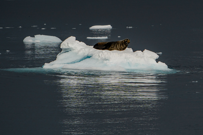 Огромные, но местным меркам вполне небольшие, глыбы льда медленно сползают с материка, как бы похрустывая и резко падают, разрывая холодную тишину всплесками и грохотом. Волны смывают греющихся на солнышке местных обитателей в воду, после чего они с недовольством карабкаются обратно.