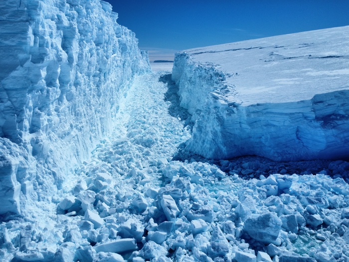 В начале декабря столовый айсберг у станции Мирный неожиданно взял и поломался пополам. Причем, сдвинувшись, перегородил обычную дорогу для императорских пингвинов, чем ввел их в изумление.
