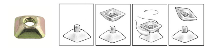 В дополнение к T-groove из прошлого поста - встречайте Pyranut (или T-slope или tufnut - у каждого производителя своя торговая марка.). Оригинальная идея квадратной пирамидальной гайки, которая затягивается при помощи второй гайки! Они навинчиваются узкими местами друг к другу, в результате чего можно вставить ключ и завернуть гайки парой, затем открутив верхнюю.
