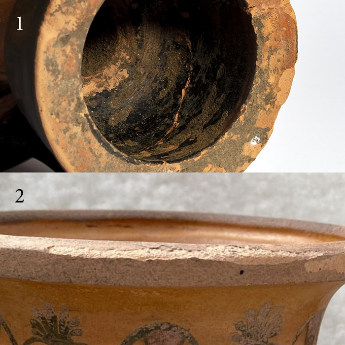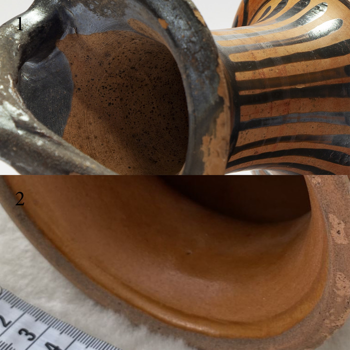 1 - небольшие сколы на венчике сосуда из коллекции A-Gallery, Москва. 2 - сколы на венчике поддельного сосуда.