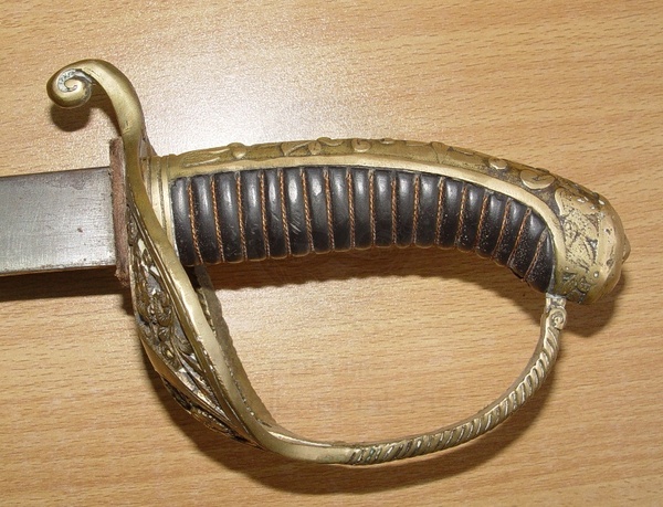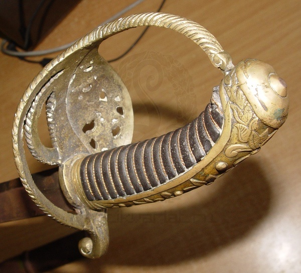 Ну и описание сабли, если кто интересуется: Сабля офицерская кавалерийская обр. 1893 г. Румыния. Клинок стальной, незначительно изогнутый, с трубчатым обухом, боевой конец двулезвийный. Клинок на половину украшен травлёными орнаментами на растительную тематику, также нанесено изображение Румынского герба. Эфес состоит из рукояти и гарды. Рукоять бакелитовая с поперечными желобками. У основания располагается металлическая втулка, украшенная рельефными растительными орнаментами. Спинка рукояти рельефная, плавно переходит в навершие. Навершие рельефное выполнено в виде головы орла. Гарда с одной основной и тремя дополнительными защитными дужками, которые плавно переходят в крестовину.