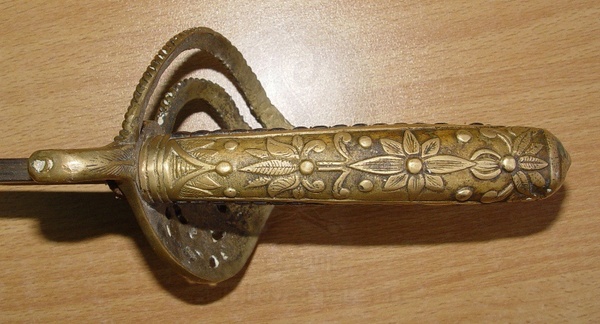 Шпага офицерская, Европа, вторая половина XVIII в. Клинок стальной, двулезвийный, шестигранного сечения. На обеих сторонах клинка имеется гравировка с орнаментом. Эфес шпаги состоит из рукояти и гарды. Рукоять металлическая, с деревянным череном, обвитым по всему периметру металлической проволокой из цветных сплавов. Головка рукояти шарообразная, украшенная рельефным орнаментом. Гарда металлическая, с одной украшенной орнаментом защитной дужкой, плавно переходящей в крестовину, загнутую вниз по направлению к клинку. На крестовине закреплена чашка, украшенная рельефным орнаментом. Между крестовиной и защитной чашкой располагаются два кольца для указательного и среднего пальца руки.