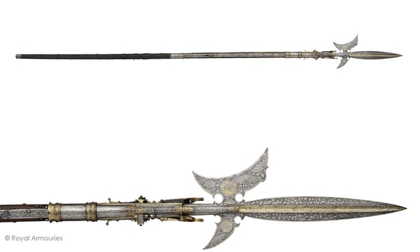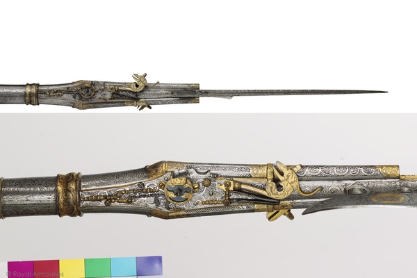 Копье, украшенное медью, серебром и золотом, оснащенное двумя миниатюрными пистолетами, Франция, примерно 1600 год. Музей истории искусств, Вена
