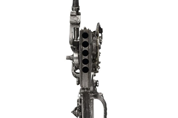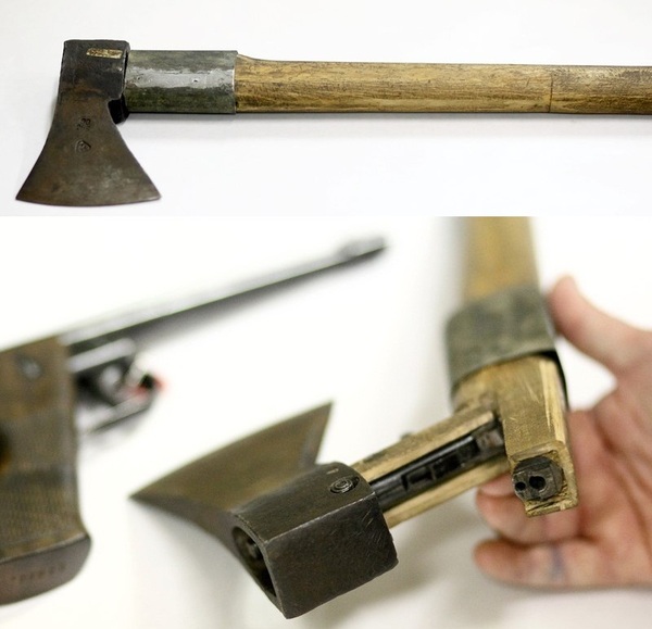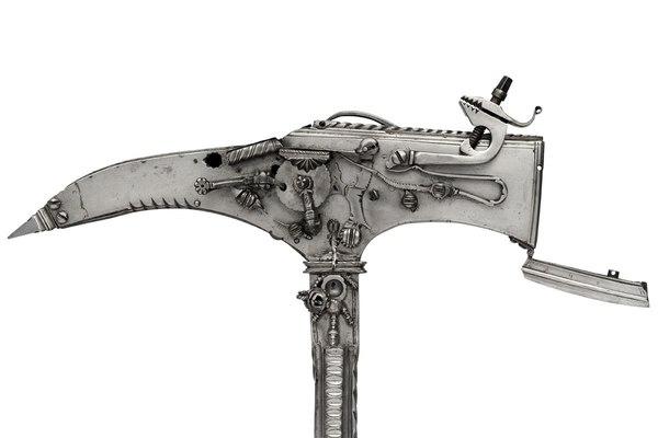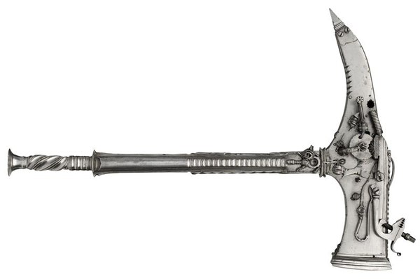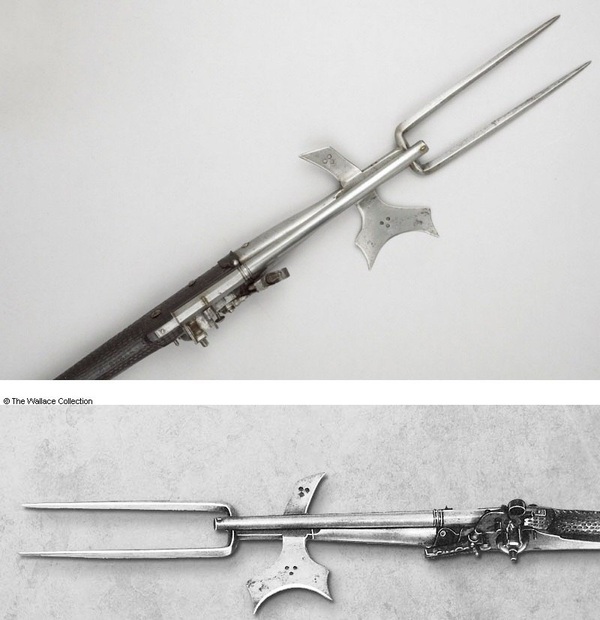 Алебарда с двумя пистолетами калибра .35, закреплённых на втулке "головы" алебарды.