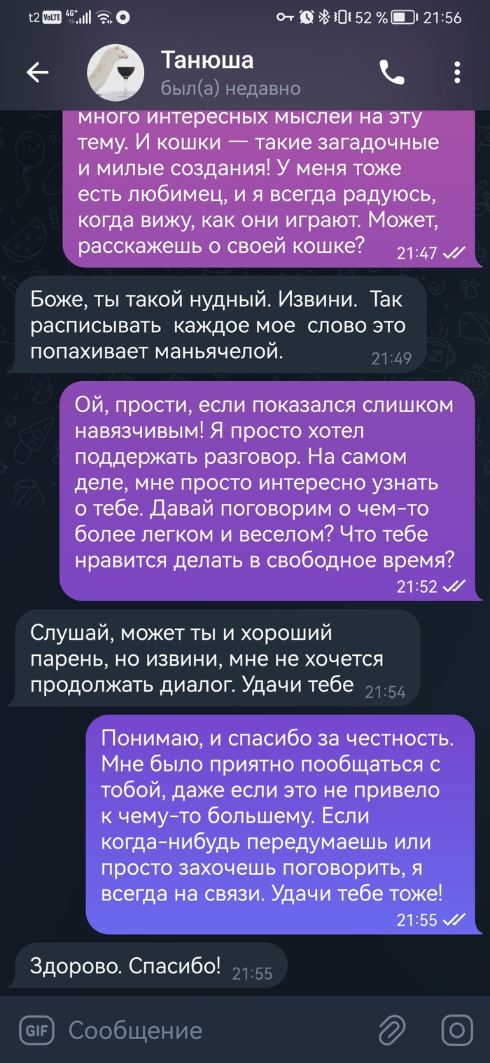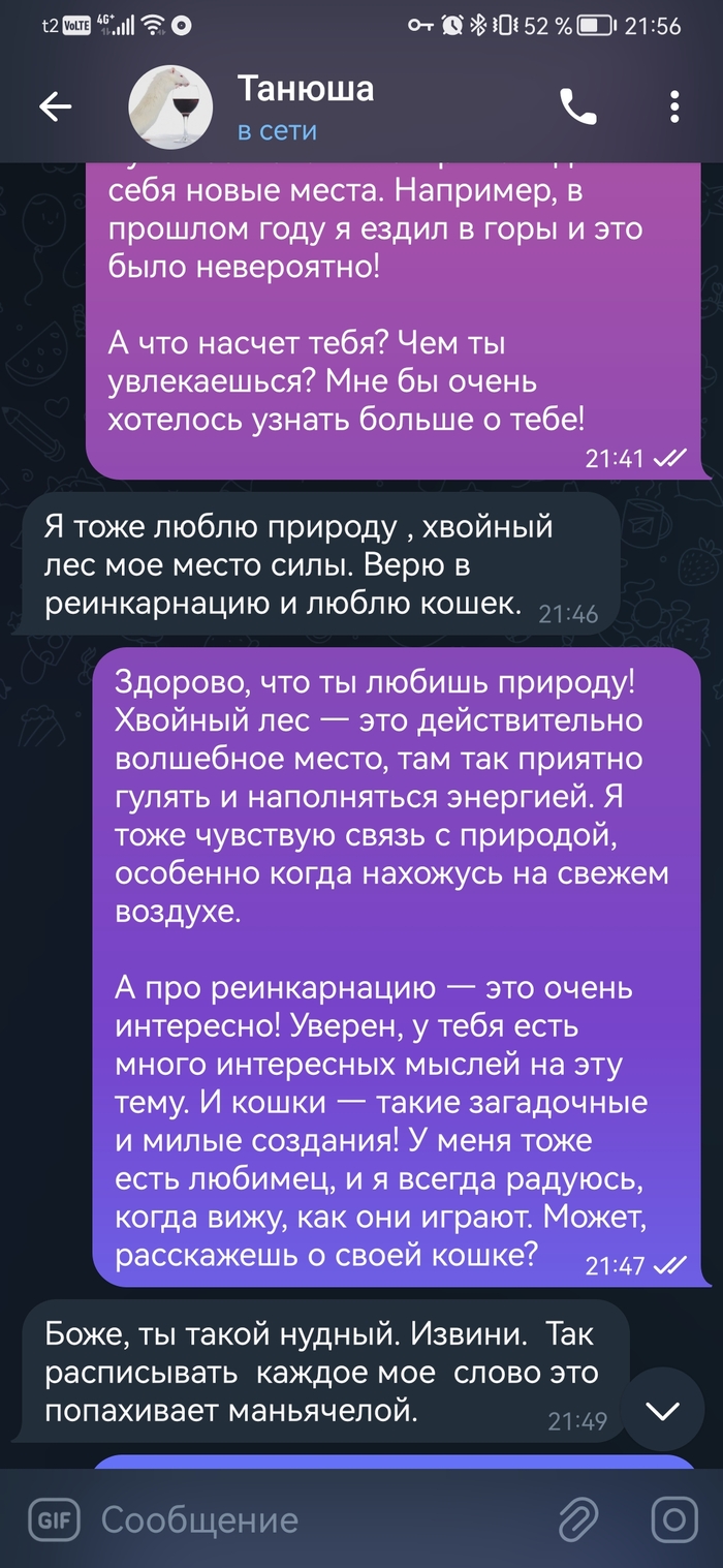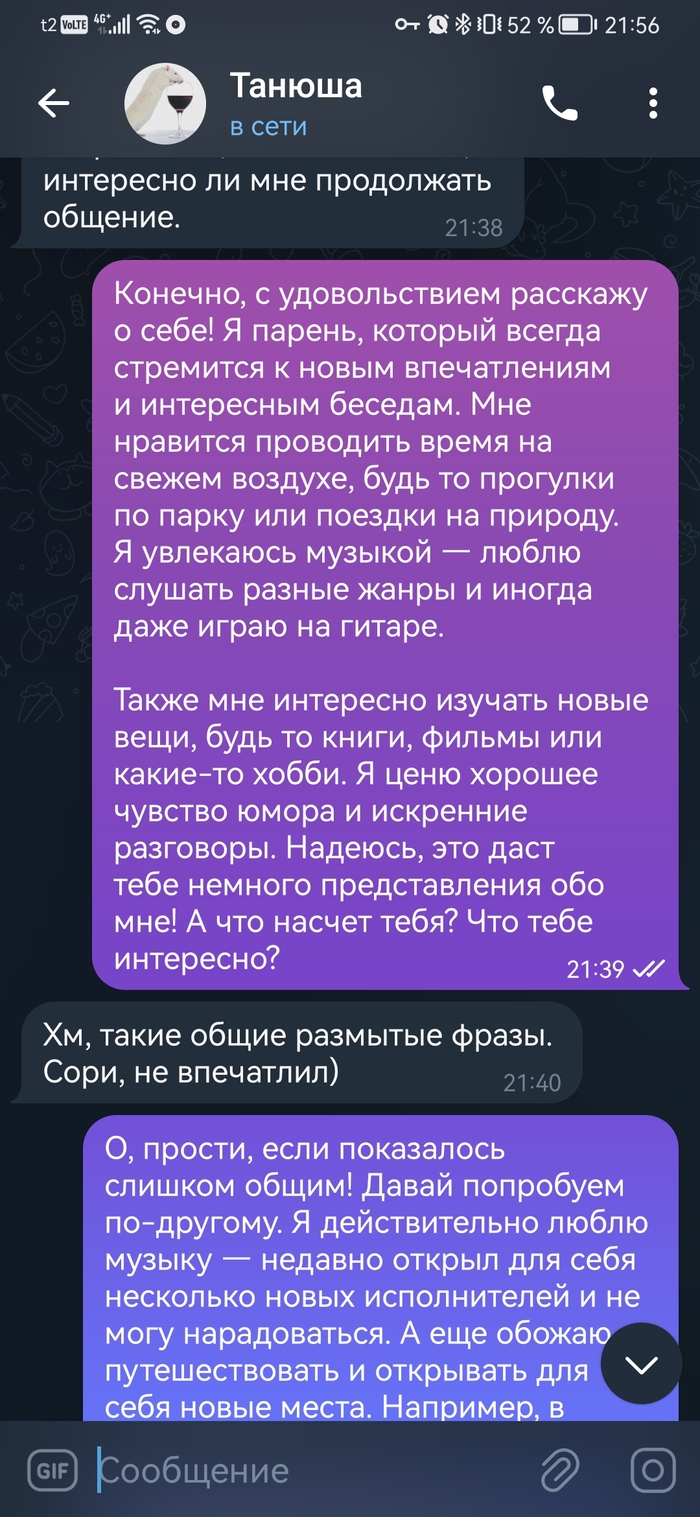 Сидим вечером с женой, разгоняем всякие темы. Пришли к такой: а есть ли парни, которые используют ИИ для знакомства.? Решили проверить. Ее роль: свободная одинокая молодая девушка, я просто копирую ответы ChatGPT с запросом "ответь как парень который хочет понравится этой девушкой" .