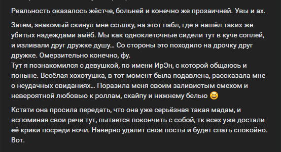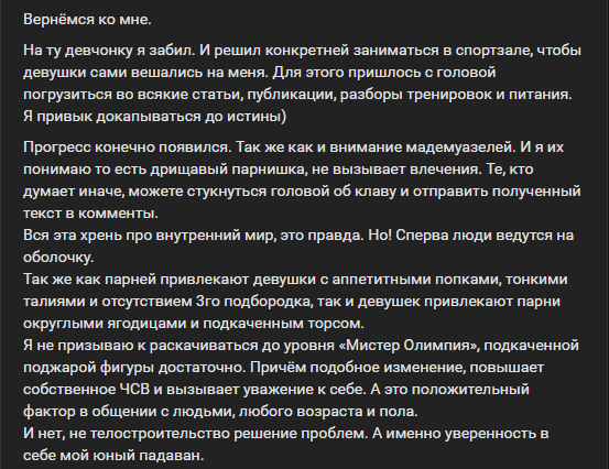 Автор радуется, как стал тру мужиком посылаю всех подружань, и как они ему сейчас написывают требуя сводить их в музей, в кино и дать на своём хребте перепихнуться со своим гопником дать поплакать в его жилетку.