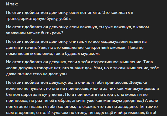 Конечно же, там были альфа самцы, которые рассказывали как себя надо вести с тЬОлочками, когда нужно двигать тазом, двигать языком изображая похотливое животное