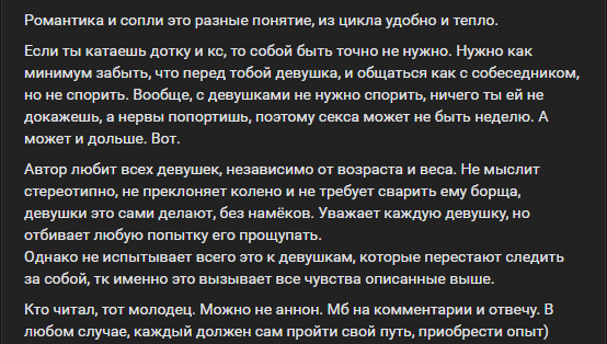 И так, значит лениво листал ленту, уплетал за обе щёки вкуснейшие щи в столовке и поперхнулся наткнулся на пост, про не такую уж и острую, многовыстраданную тему межполовых отношений.