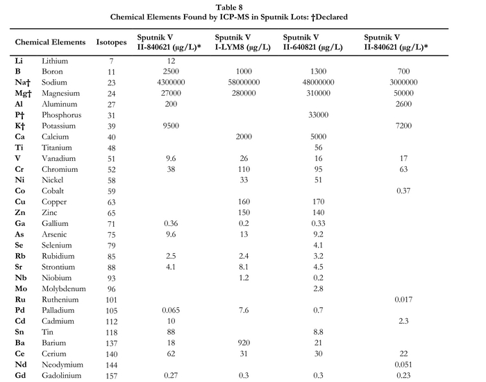 А статья про 55 элементов... Ну, что. Они "сенсационно" открыли присутствие атомов этих элементов в вакцинах. В основном, конечно, шпыняют вакцину от Pfizer и Moderna, поскольку их тупые читатели в основном из западного мира, где были использованы эти вакцины. Но для наших тупых читателей они и Спутник исследовали (а для китайских дураков - китайскую вакцину. В общем, постарались охватить все массы). По Спутнику их "исследование" дало вот такие результаты: