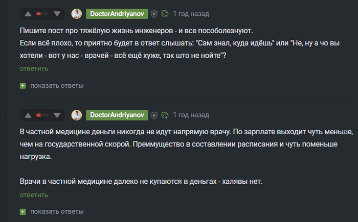 И отсюда можно предположить, из чего истекают все его действия. Ему хочется зарабатывать больше. Но он не пошел по варианту идти чтобы повышать свою квалификацию, получать степени кандидата и доктора медицинских наук, как то делает подавляющее большинство врачей, ну или просто, как сам признает, "повышать нагрузку". А вместо этого идет на самые странные способы, кроме уже указанной вызывающей испанский стыд "баночки для чаевых на вызовах скорой", была и реклама его закрытого платного чата с его участием, на каждый пост "украшает" ссылка на ТГ или ВК где оказывают платные услуги, конечно же подключен донат на Пикабу. А все, кто не помогают зарабатывать, попадают в разряд "они мешают моему бизнесу" и под банхаммер.