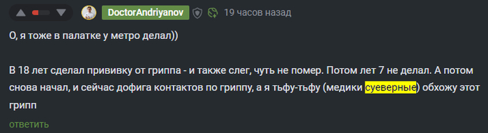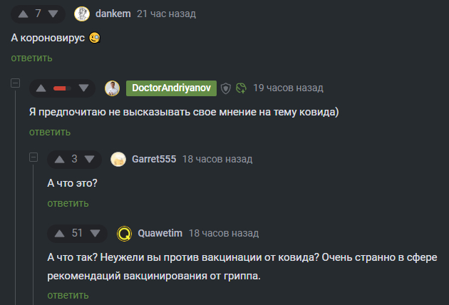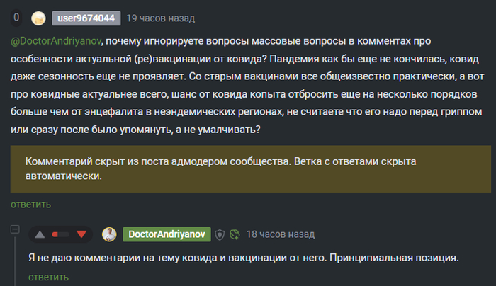 На днях в Лучшее вышел пост на тему прививок для взрослых от врача-педиатра Андриянова Станислава Юлиановича, на Пикабу известного как @DoctorAndriyanov. В списке прививок почему-то не нашлось упоминания вакцины от ковида, хотя от намного менее опасных заболеваний нашлось и объяснений этому нет. Большую часть комментариев с вопросом про это ТС проигнорил, а на остальные дал невнятные ответы: