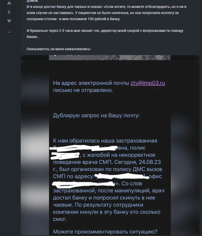 Причем можно было бы подумать, что разница между "чаевых" чисто коммерческой обслуге в увеселительном заведении и между чаевыми от зависимого лица в вызывающем опасения за жизнь состоянии (а на частной скорой, полагаю, случаи серьезные, если человек готов ее вызвать и платить за нее). Ему в комментах также развернуто пояснили, что это уже на грани с коррупционным поведением и ненулевая вероятность, что пришлось бы оправдываться перед компетентными органами, но он не по глупости на это пошел, а заранее зная что бывают "проблемы":