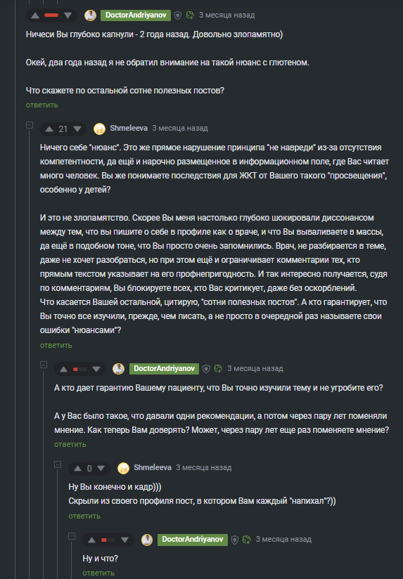 К самому доктору обращаться, увы, бесполезно, по всей вероятности проигнорирует пост и пройдет мимо, а то и просто скажет, что он врач которому недоплачивают, а я токсик, хейтер, злопамятный, глубоко копнул и не заметил 99% полезных постов (а я буду и справедливым, полезное тоже есть, но ложка дегтя в бочке меда всю бочку загрязняет) да и вообще ну и что с того.
