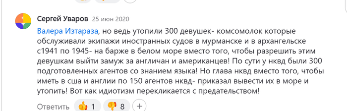 Вон попался мне один такой комментарий, где один человек , на полном серьезе, не приведя никаких источников информации, утверждает что злобные чекисты, утопили в барже 300 девушек, которые обслуживали экипажи иностранных судов в Мурманске и Архангельске. И да, я попытался найти, где он весь этот бред взял, но ничего так и не нашел.